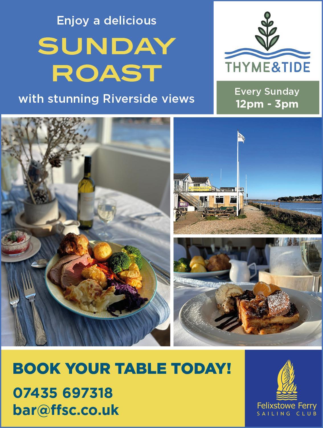 If you would like to make a reservation for our Thyme & Tide restaurant please email bar@ffsc.co.uk or leave a message on T: 07435 697318 and Lynne will reply to you during her normal working hours.